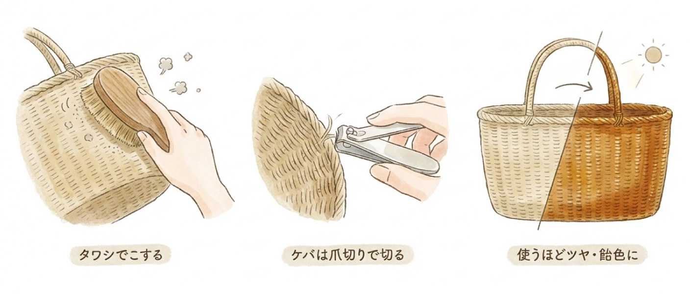 網目に埃などが入りますし、ケバなどが出る場合がありますので時々タワシで表面をこすり、ケバは爪切りで切ってください。使えば使うほど表面がツルツルになり、色も飴色に変化していきます。