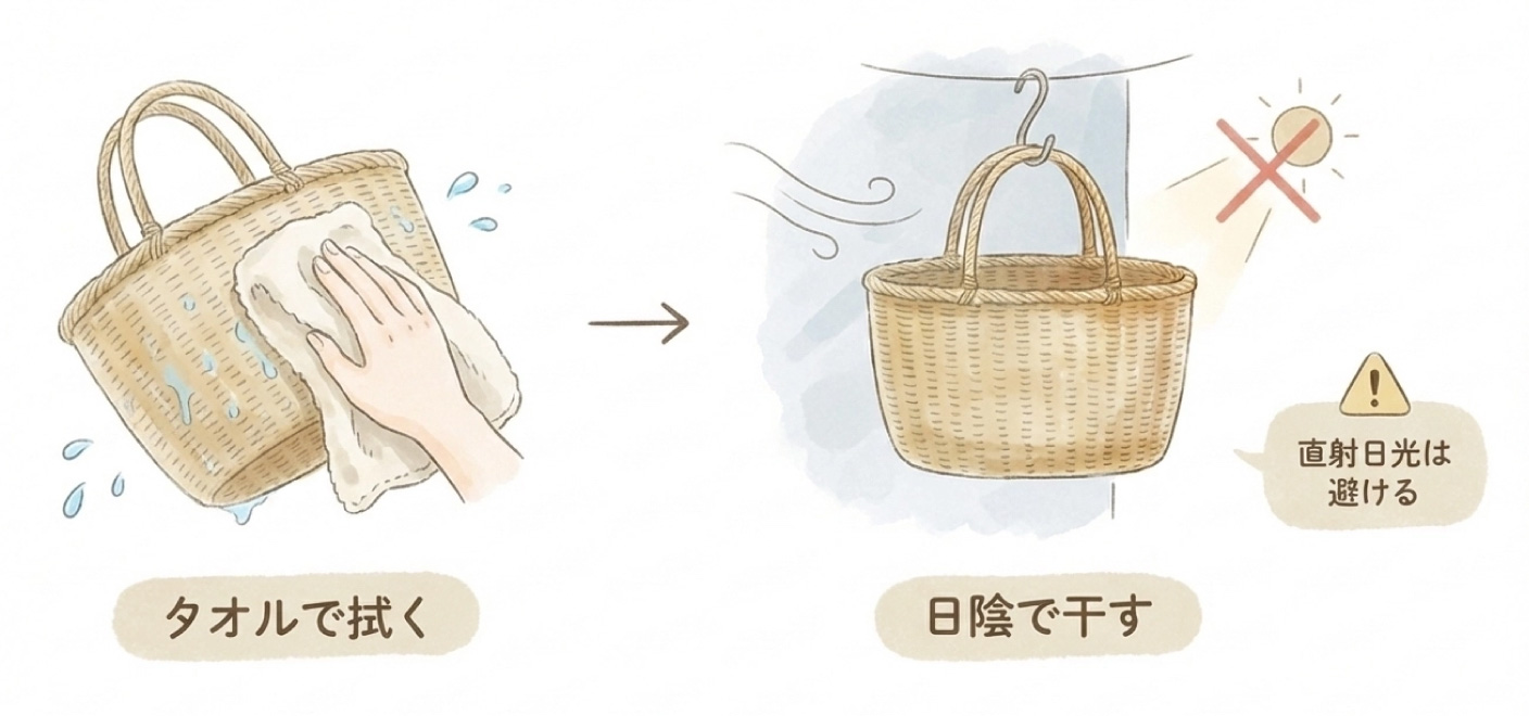 すぐに乾いた布で拭き取り、風通しの良い場所で陰干ししてください。湿気がこもる環境はカビの原因になります。